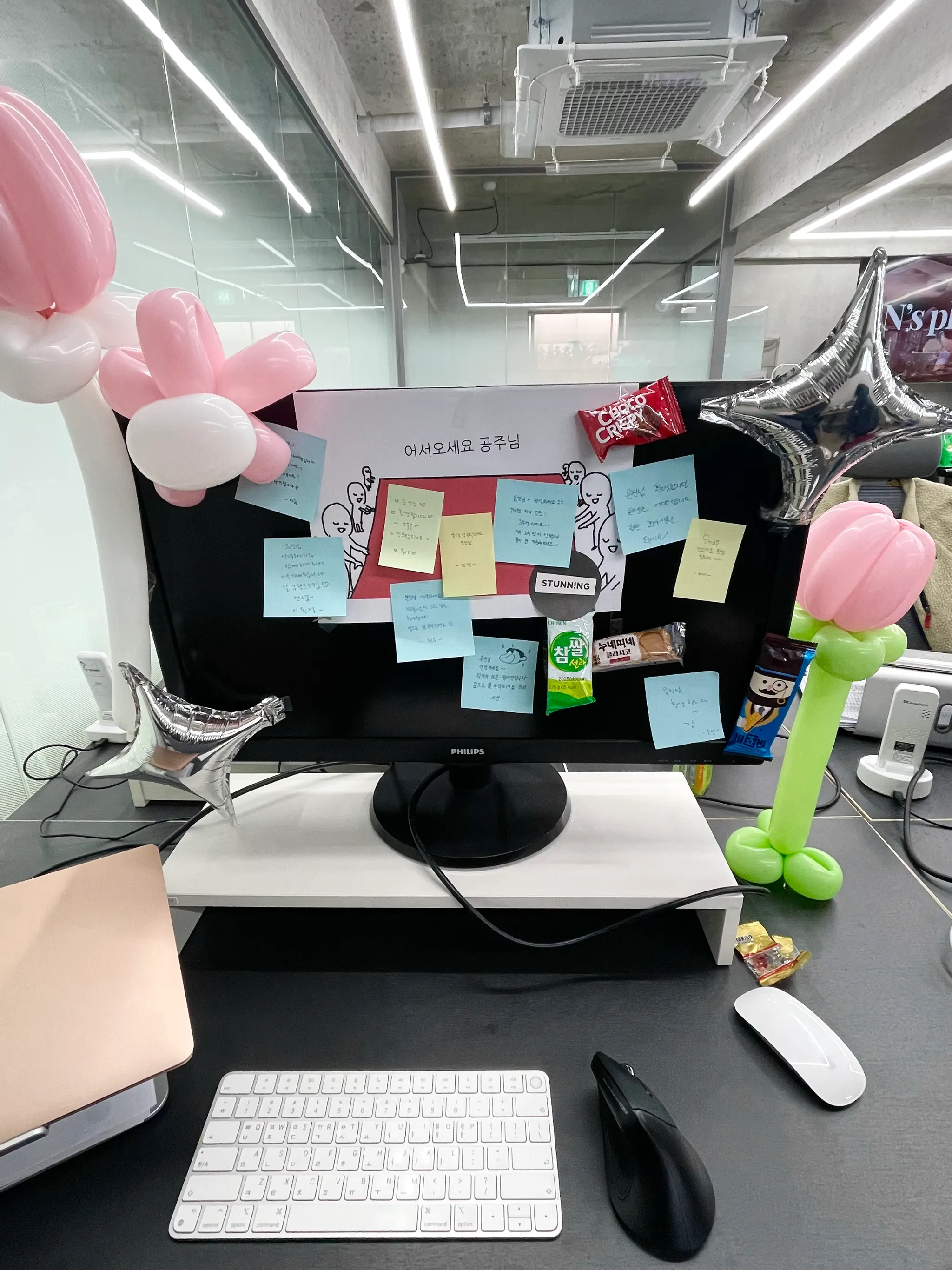 어색하게 뚝딱대며 자리에 앉자마자 눈앞에 보인 건 모니터를 화려하게 감싸는 풍선들