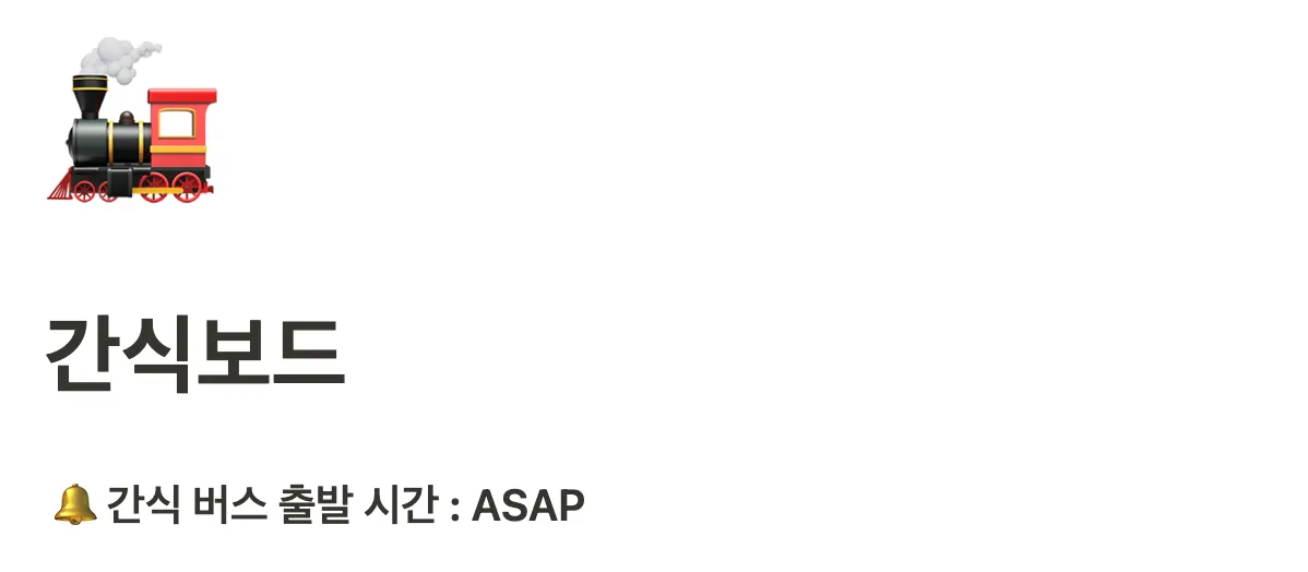 최애 복지 넘버 2. 바로 간식열차~ (뿌뿌) 약 한 달에 한 번 간식 열차가 찾아오는데요. 노션 간식 보드를 통해 원하는 간식을 신청할 수 있어요. 4층 간식 창고가 절대 비어서는 않되.