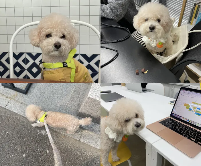 노트폴리오 최강 복지 넘버 1. 강아지도 함께 출근 가능. 사진은 몇 달에 한 번씩 정기출근 중인 명예 직원 (((깻잎이