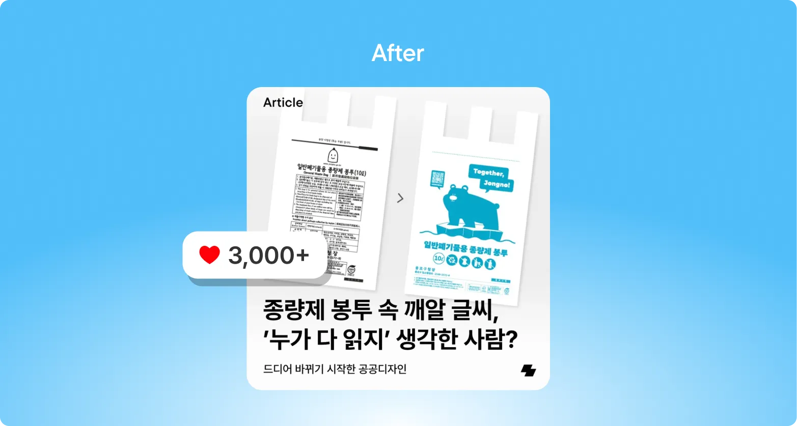 수정된 카피의 경우 누구나 한 번쯤 생각해봤을 내용을 담았어요. 스크롤을 내리다가 이 카피를 마주하면 ‘맞아, 나 그랬는데!’라는 생각이 들면서 멈추게 되죠. 같은 이슈도 읽는 사람이 어떻게 받아들일지, 이 이슈가 그 사람과 어떤 관련이 있는지를 고려해서 작성하면 이렇게 전혀 다른 카피라이팅이 나오게 돼요. Before 버전으로 올렸다면 100 미만이었을 인게이지먼트를, 3천 이상으로 올릴 수 있었던 이유예요.