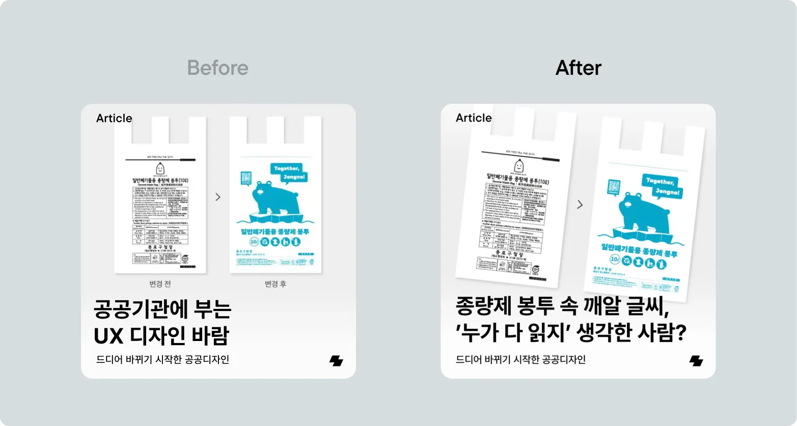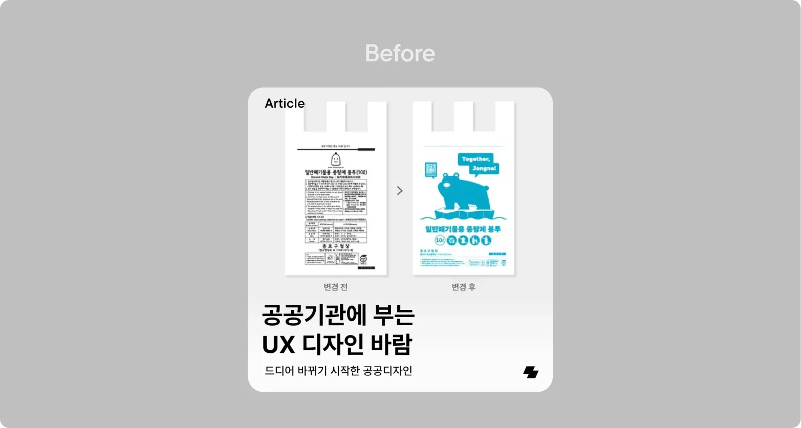 수정 전 카피는 위에서 말했듯, 위 기준 중 어떤 것도 충족할 수 없어 보여요. 공공기관에 UX 디자인 바람이 분다는데, 정확히 어떤 바람이라는 건지도 모르겠고 공공기관에 부는 바람이 나랑 무슨 상관인지 모르겠기 때문이죠. 하지만 수정 후 카피는: