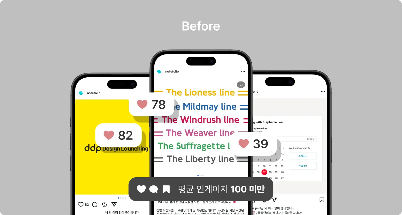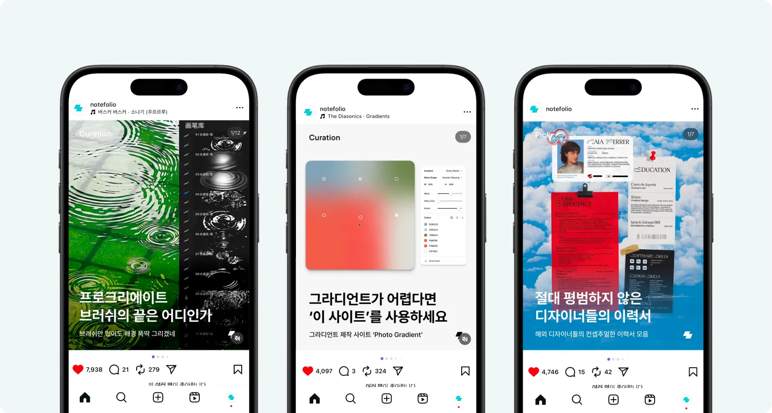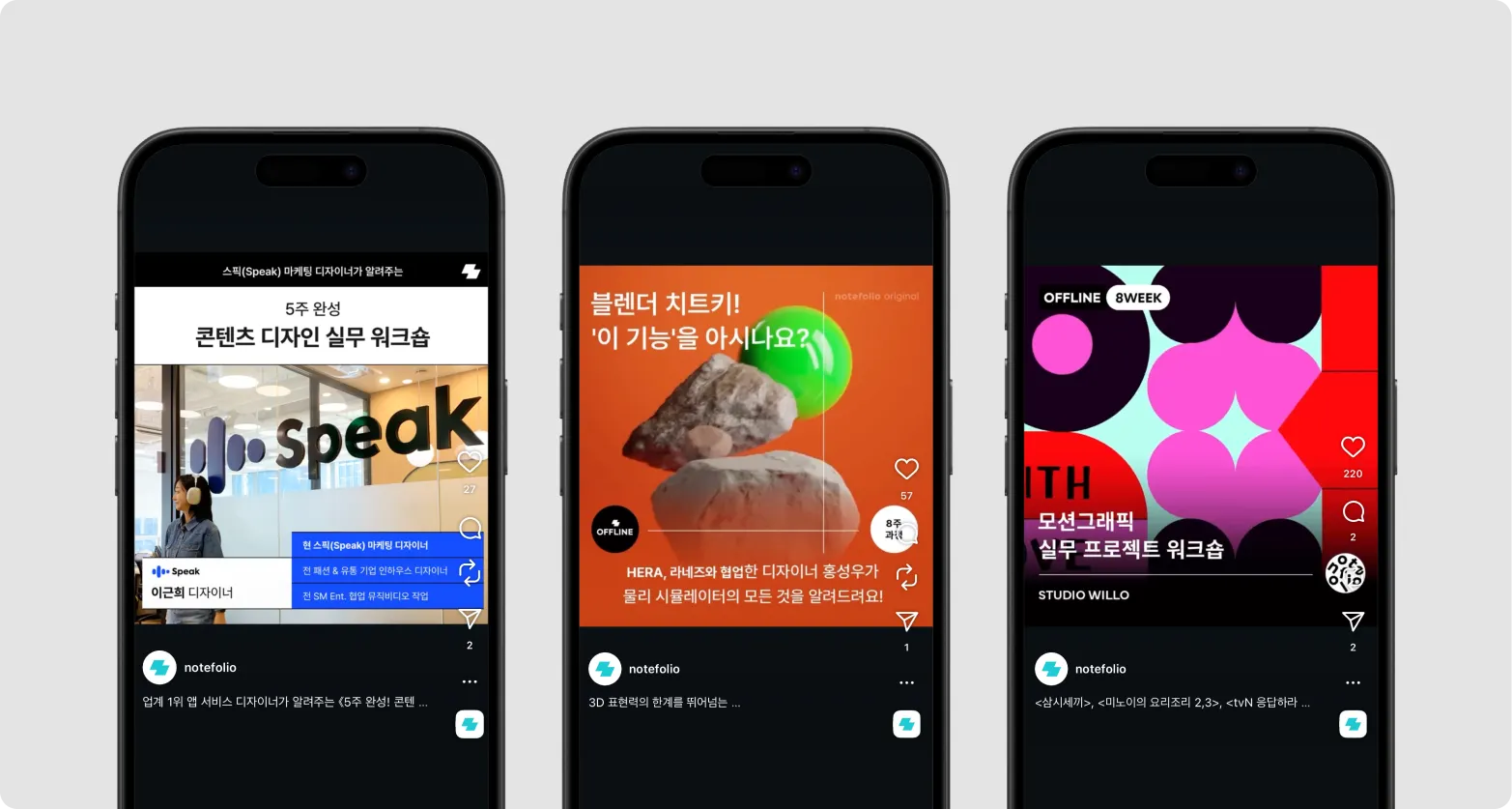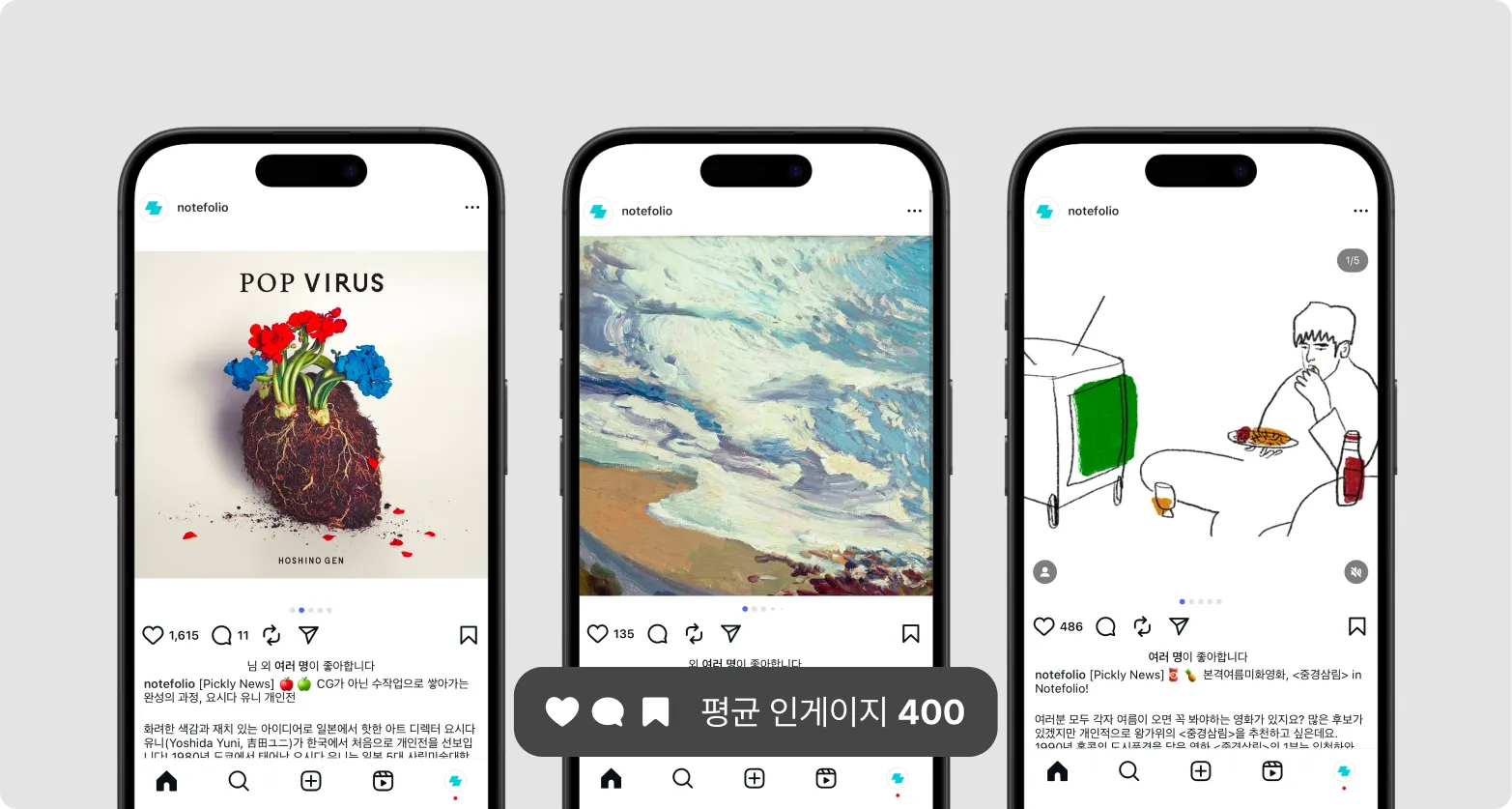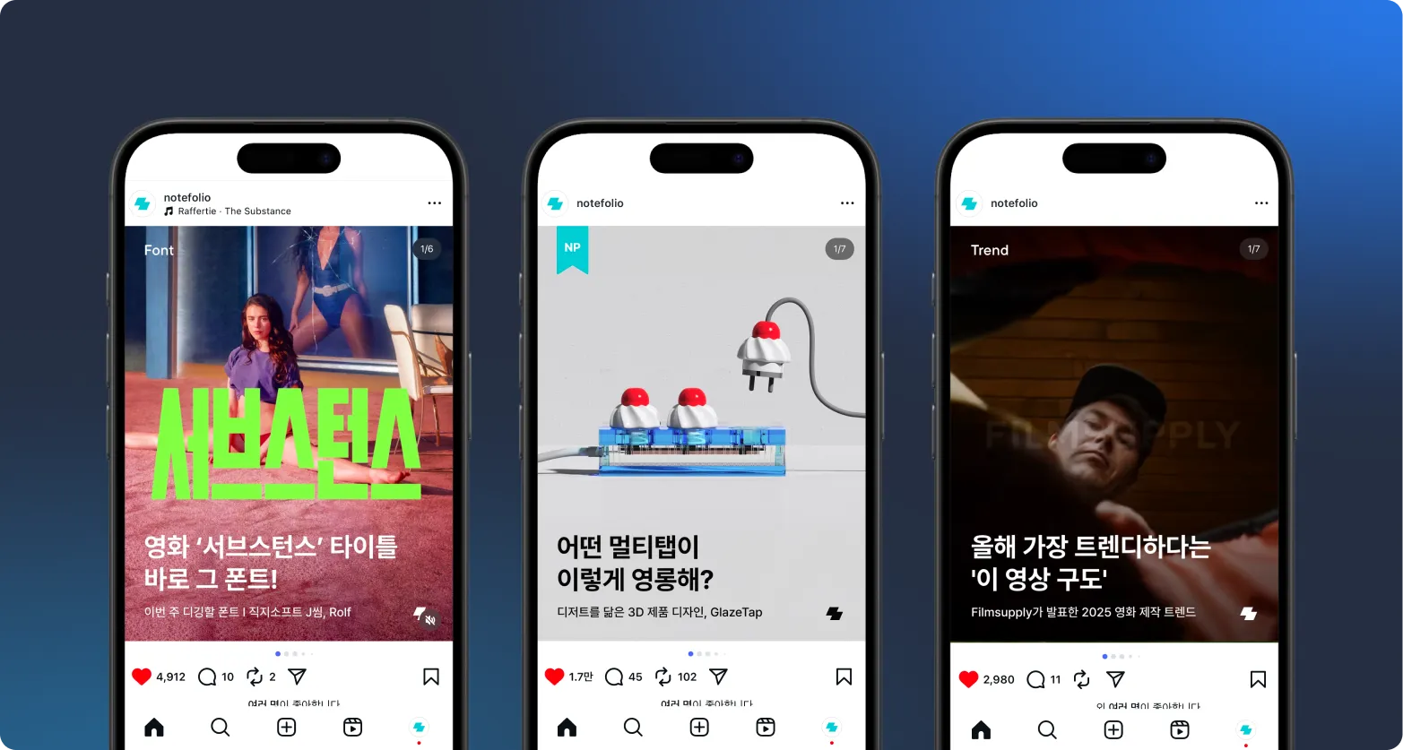 이때 노트폴리오 인스타그램에서는 크게 3가지의 콘텐츠가 발행되고 있었어요. 하나씩 알아보면: