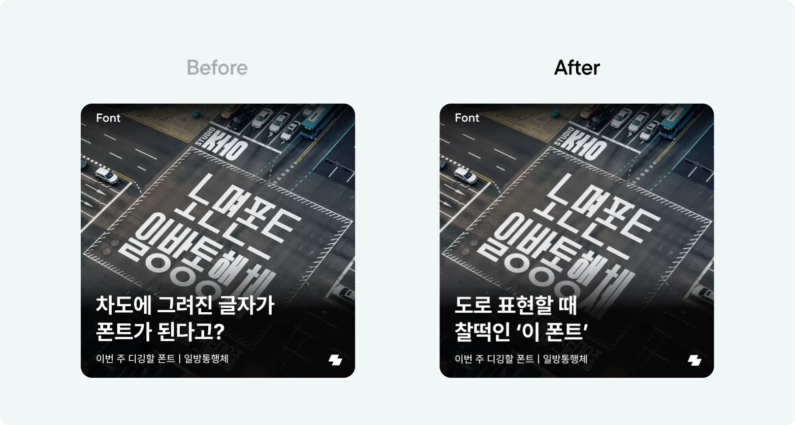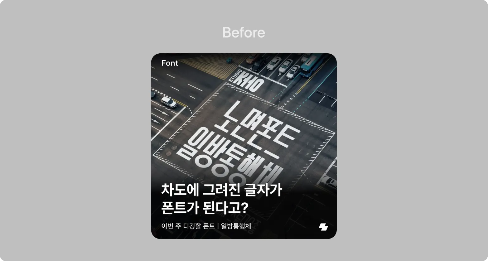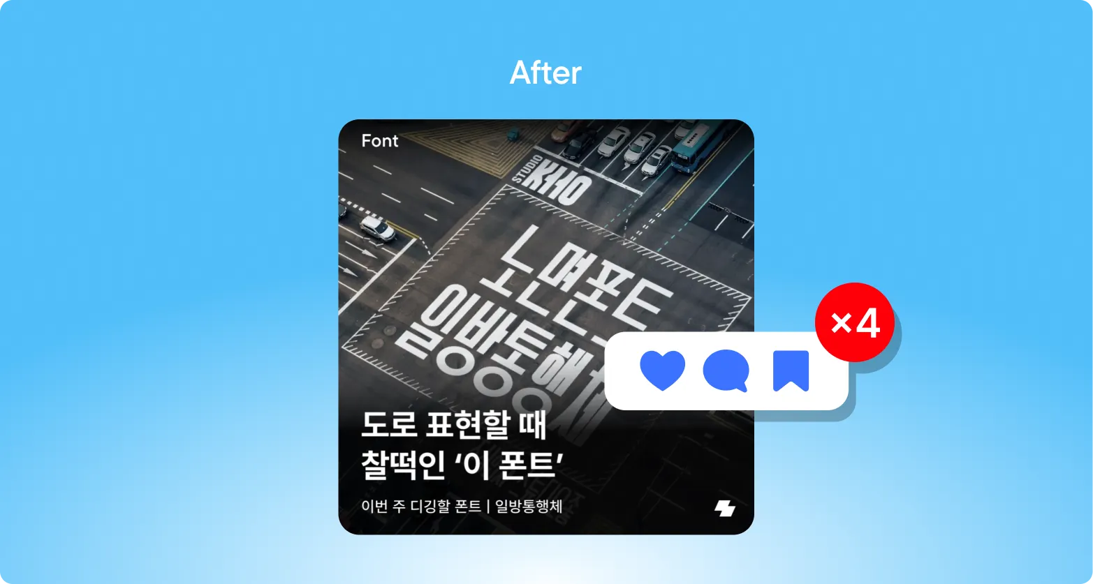 수정된 카피인 ‘도로 표현할 때 찰떡인 이 폰트’에서는, 이 폰트를 쓸 수 있는 상황을 직접적으로 제시했어요. 왠지 언젠가 도로를 표현할 일이 있을 때 쓸 수 있을 것만 같은 느낌을 들게 하죠. ‘찰떡인’이라는 입말 표현을 통해 더 친근하게 다가간 것도 또다른 포인트! 덕분에 기존 폰트 소개 콘텐츠보다 4배 이상 높은 인게이지먼트를 달성할 수 있었습니다.