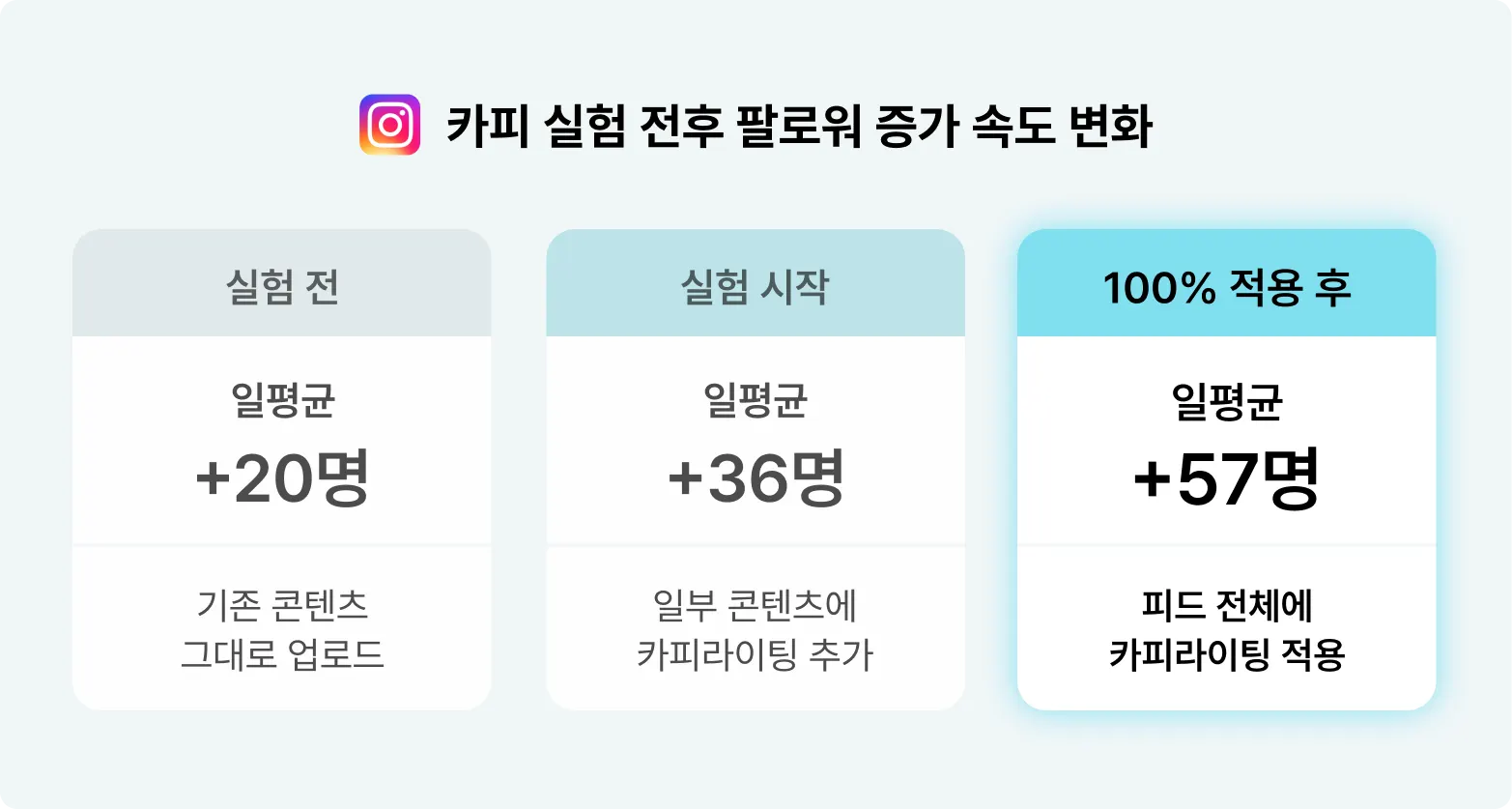 카피 실험을 시작하기 전 약 3개월 동안, 노트폴리오 인스타그램의 팔로워는 하루 평균 20명 정도씩 늘고 있었어요. 하지만 카피 실험을 시작한 뒤에는 일평균 36명으로 늘어났고, 피드를 100% 카피라이팅 형식으로 전환한 이후엔 하루 약 57명씩 늘어나기 시작했습니다. 팔로워 증가 속도가 약 3배 빨라진 셈이에요. 결국 ‘카피라이팅 형식을 취하면 인게이지가 올라가고, 인게이지가 올라가면 팔로워도 늘어날 것이다’라는 가설을 데이터로 증명할 수 있었죠.