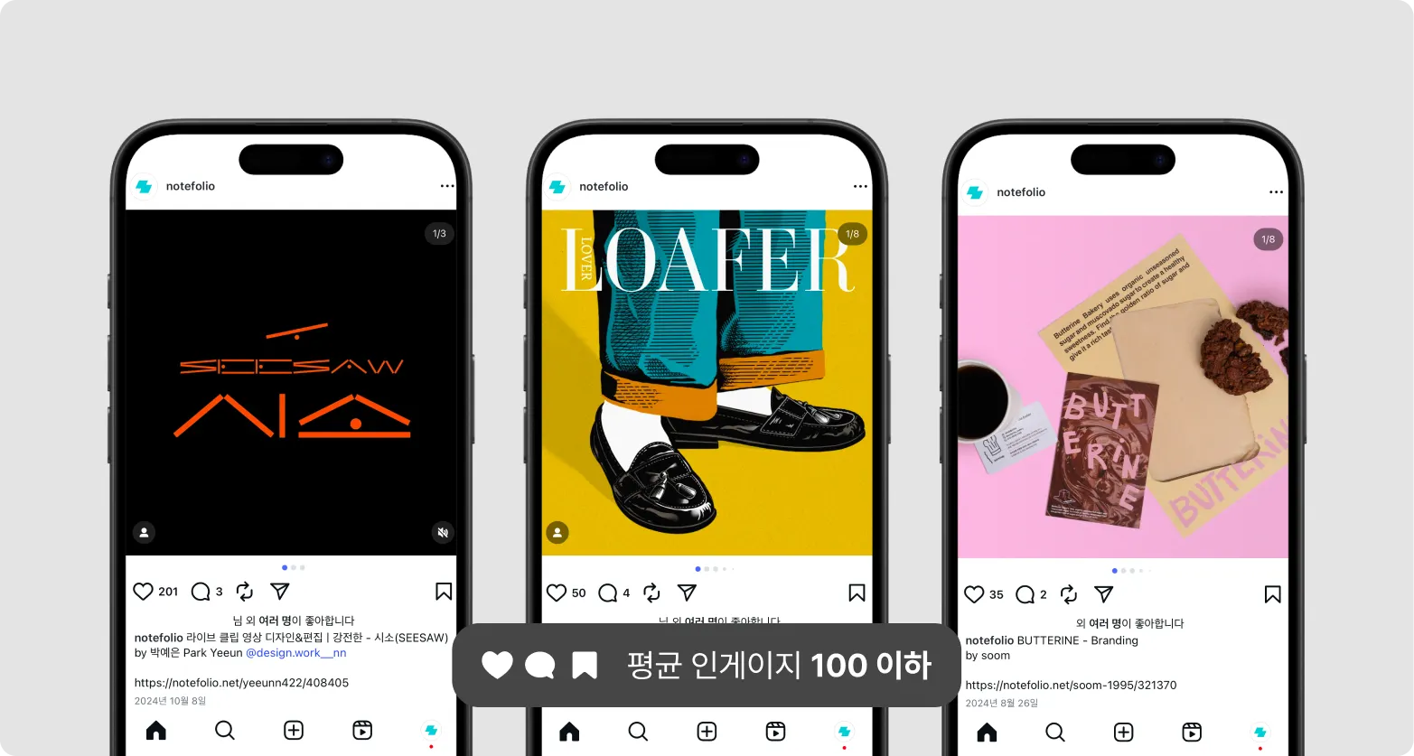 하지만 밑도 끝도 없이 작업물과 제목, 링크만 올렸기 때문에 인게이지먼트는 정말 낮았어요. 아주 가끔 작업물이 예쁘면 반응이 좋을 때도 있었지만, 평균적으로 100 이하의 인게이지를 기록했던 콘텐츠입니다.